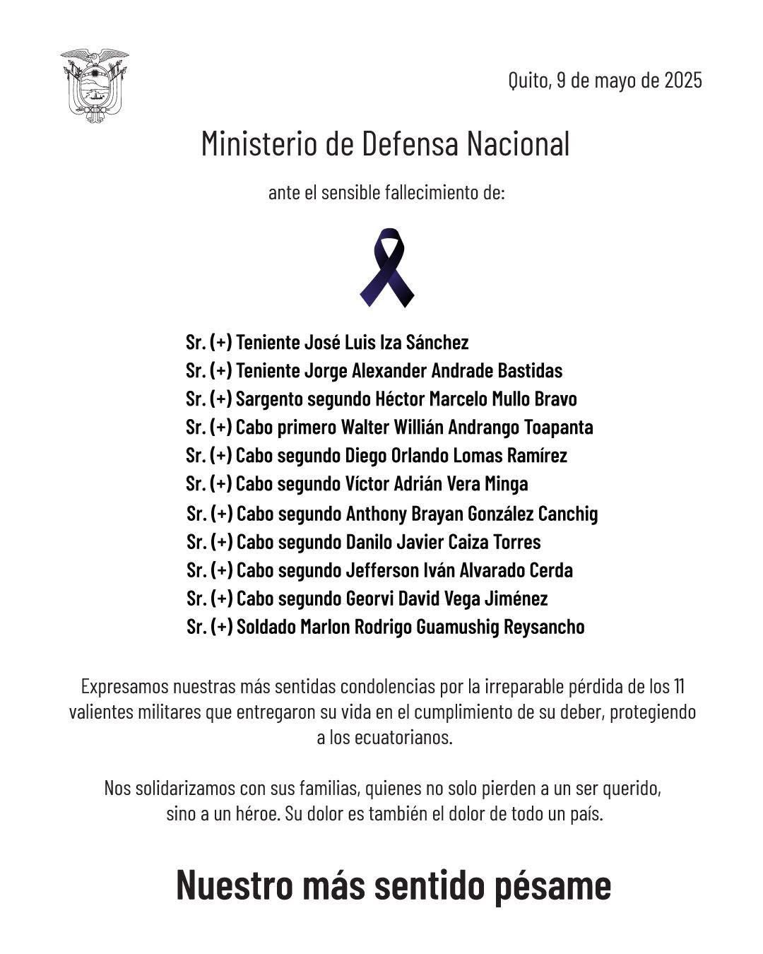 Los militares ofrendaron su vida en cumplimiento del deber, demostrando honor, valentía y un firme compromiso con la defensa de la patria y la seguridad de todos los ecuatorianos.