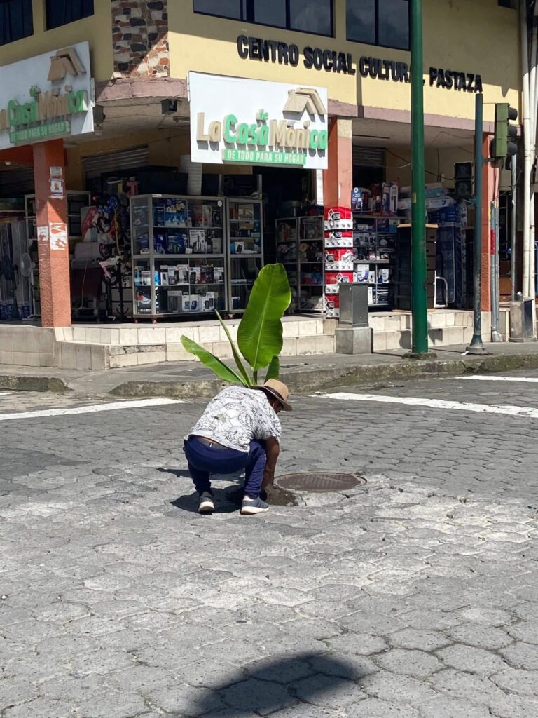 siembra una planta de platano en la Francisco de Orellana y 9 de octubre esquina del Municipio de Pastaza, hueco que desde hace tiempo causa malestar a los vehículos y transeúntes esperando hacer conciencia en la autoridad municipal.