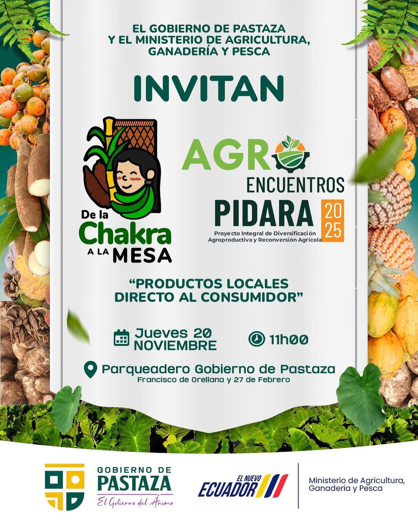 El Ministerio de Agricultura y Ganadería y el Gobierno de Pastaza unen De la Chakra a la Mesa y los Agroencuentros PIDARA para ofrecer productos locales, frescos y directos del campo.