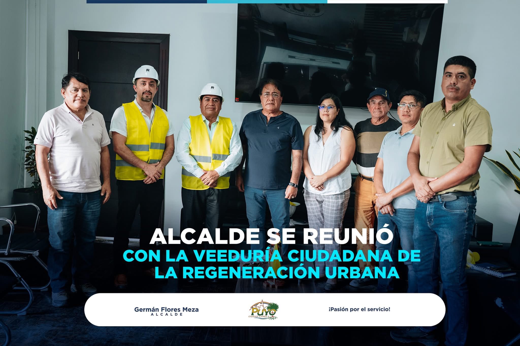 se reunió con los integrantes de la Veeduría Ciudadana del proyecto de regeneración urbana del centro de Puyo, conformada por Fabián Valla, coordinador; Nayeli Vilema, subcoordinadora; y Esteban Osorio, secretario.