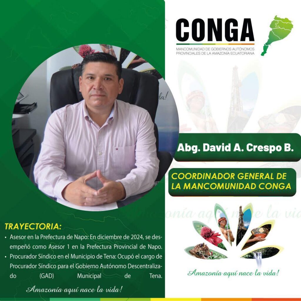 La Mancomunidad de Gobiernos Autónomos Provinciales de la Amazonía Ecuatoriana – CONGA se honra en anunciar la designación del Abg. David Alfredo Crespo Bilmonte como nuevo Coordinador General. Su liderazgo representa una oportunidad para renovar la esperanza, fortalecer los lazos institucionales y proyectar una Amazonía unida, productiva y sustentable, donde el desarrollo se construya desde …