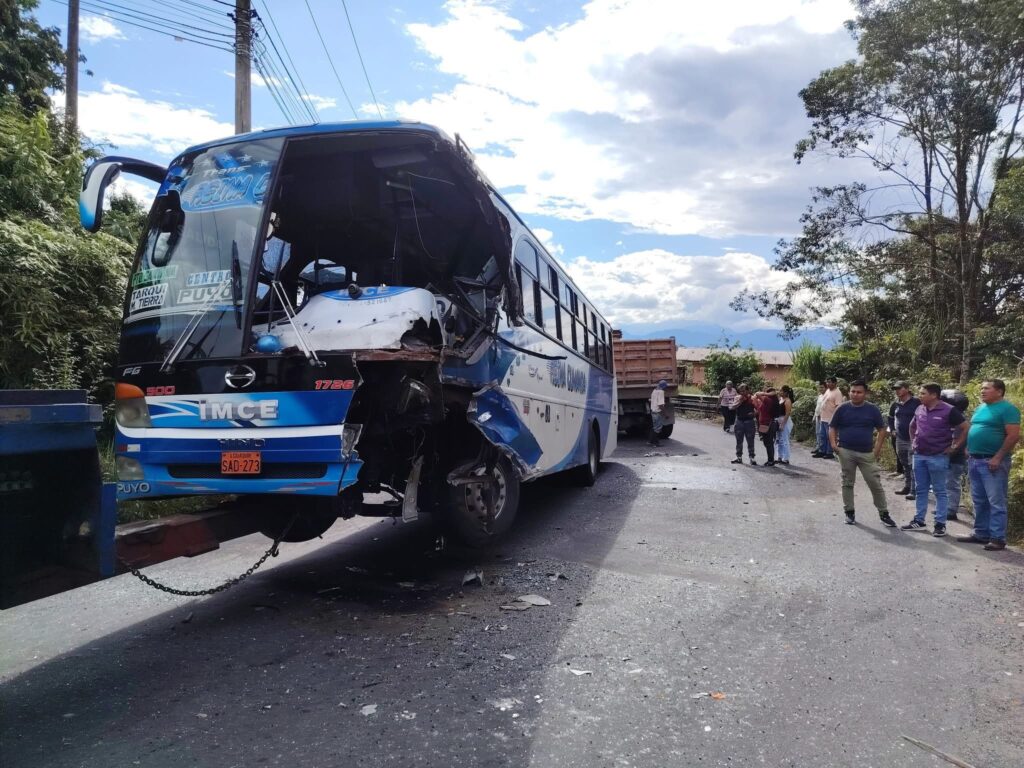 este lunes 20 de octubre de 2025, en una de las curvas cerradas de la vía, se produjo un choque entre una unidad de la Cooperativa Reina Cumandá y un volquete particular, con daños únicamente materiales